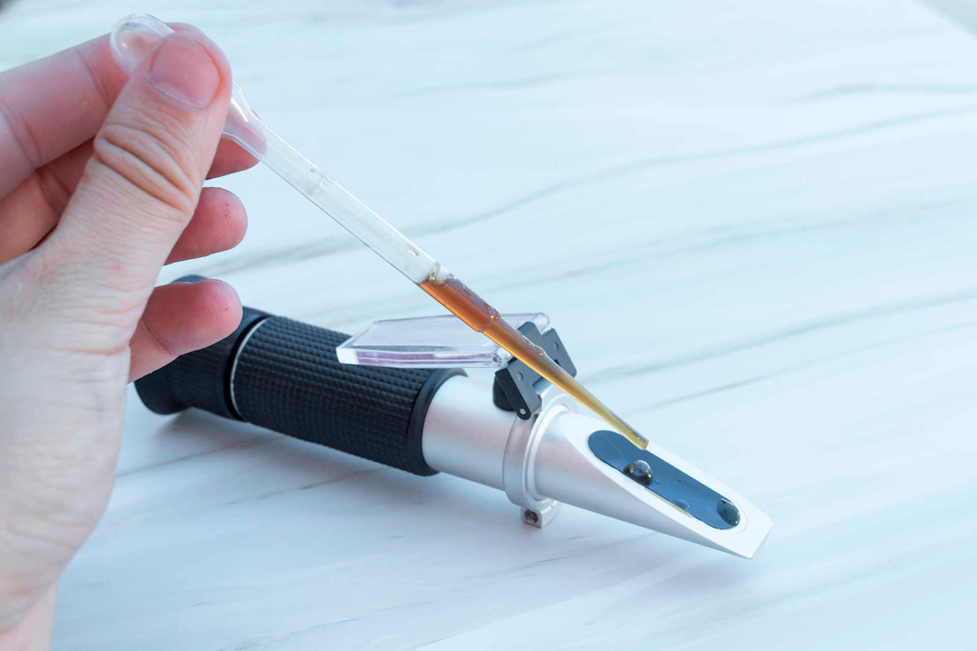 A medição é feita com um refratômetro, que pode ser analógico (como os de Abbe) ou digital. O princípio é sempre o mesmo: analisar como a luz se comporta ao passar pelo prisma do equipamento e pela amostra.